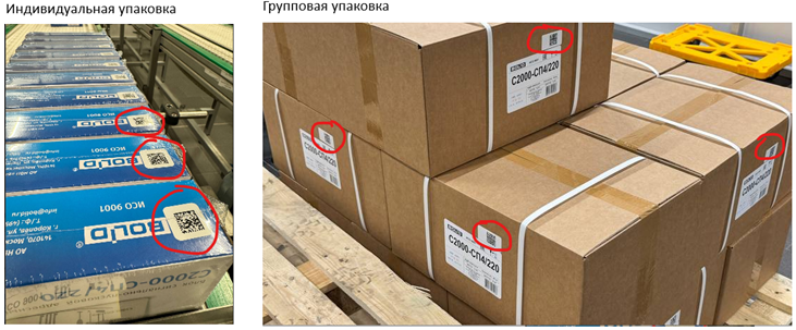 Пример нанесенной маркировки на индивидуальную и групповые упаковки: