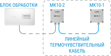 Монтажный комплект вводный МК10-2 АЦДР.426477.001 необходим для обеспечения герметичного подключения чувствительного элемента к блоку обработки посредством переходного кабеля. Коммутация между блоком обработки и МК10-2 осуществляется с помощью одножильного огнестойкого кабеля для систем противопожарной защиты с допустимым сечением жил: 0.5, 0.75 и 1.0 мм².